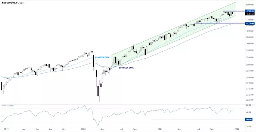 在日曆即將翻到2022年之際,涵蓋範圍更大的標普500指數的上漲趨勢相比道指更加清晰牢固。標普500指數在過去18個月明確形成了上漲通道,通道的支撐位在4500附近,那裏彙集了通道下軌與21周指數移動均線。過去一週收於4620.64。