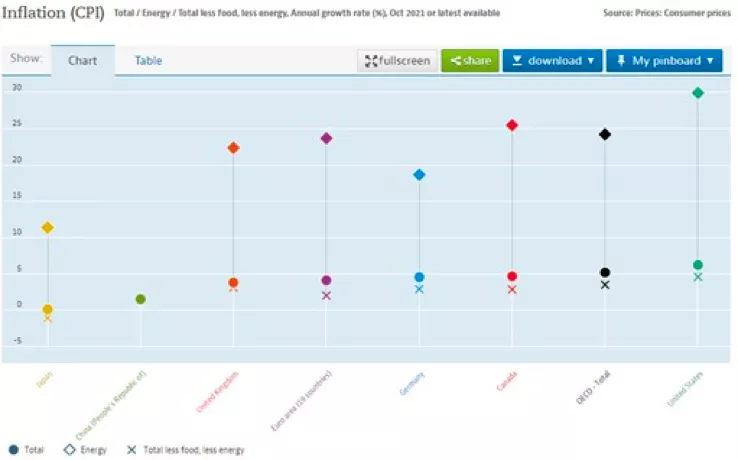 | 各國通脹情況。來源:OECD,數據來源為2021年10月