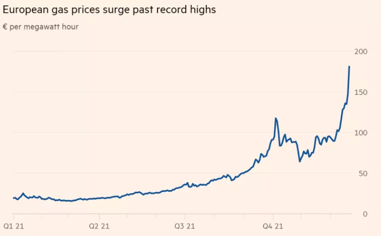 這次飆漲20%原因簡單:俄羅斯一個向德國輸送天然氣的重要管道流量降低為0,歐洲天然氣和電力價格雙雙創出紀錄新高,漲超20%。
