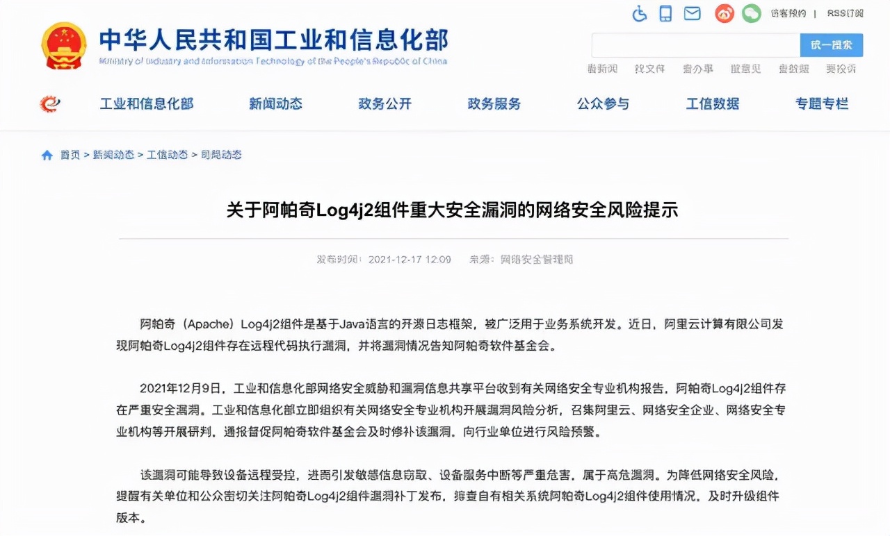 中國工信部收到有關網絡安全專業機構報告,發現阿帕奇Log4j2組件存在嚴重安全漏洞,立即召集阿里雲、網絡安全企業、網絡安全專業機構等開展研判,並向行業單位進行風險預警。