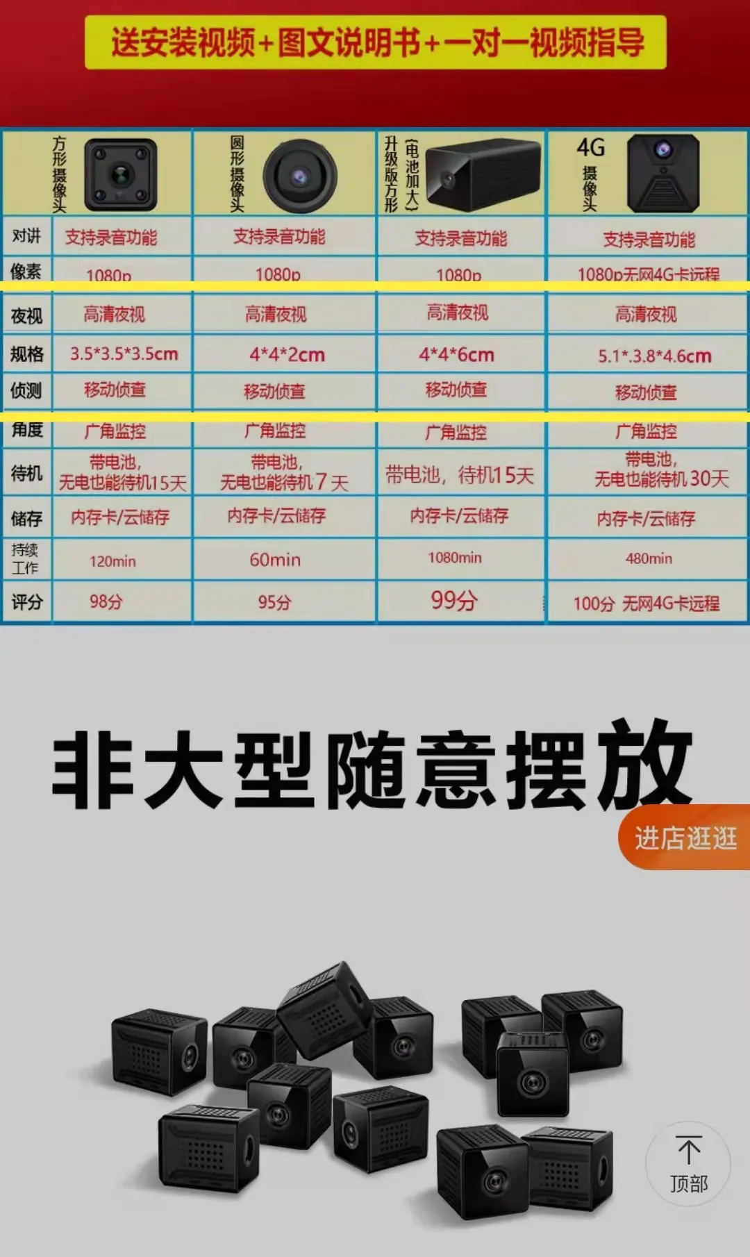 在各平台搜索此類產品,平台無一例外進行了屏蔽,但如果有心,通過變換“針眼”、“微型”等搜索詞,還是能精準找到針孔攝像機產品。你甚至也可以直接通過家用攝像頭的正規查找途徑,找到一些如長寬高不超過5cm,疑似與針孔攝像頭同類型的產品。