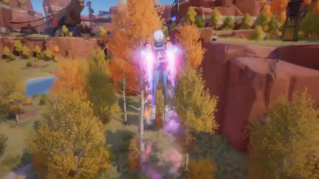 “開放世界”更像是《幻塔》的一層外皮。遊戲背景設定在一顆被輻射摧毀的外星球,玩家也可以在末世廢土風格的大地圖上與世界進行各項交互,比如打穿岩石獲得寶箱、射火箭點燃草地等。但“探索世界”的方式非常便捷,藉助滑翔翼、滑板、機械臂等“源器”可以自由自在地上山下水,解鎖載具後移動能力還會進一步增強,載具有常規的摩托、飛艇,也有科幻感更重的機械馬、魔方,和MMO中五花八門的坐騎很像。