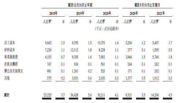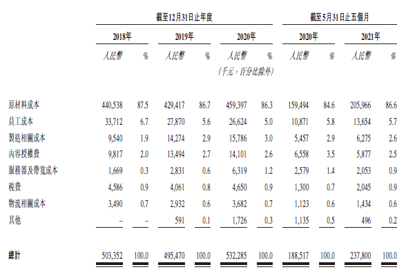 2018年至2020年以及2021年前5個月,讀書郎教育的原材料成本分別達到4.41億元、4.29億元、4.59億元和2.06億元,分別佔總營收比為69.78%、64.03%、62.53%和65.4%。