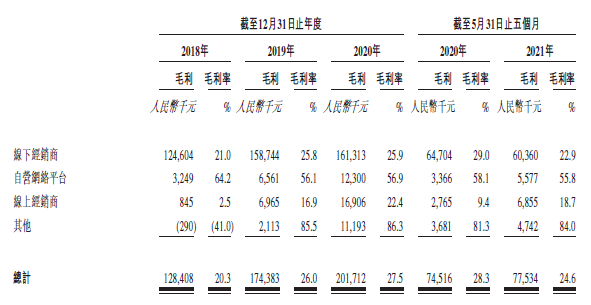 在對線下經銷商的高度依賴下,讀書郎教育的利潤空間也進一步被壓縮。2018年至2020年以及2021年前5個月,來自線下經銷商的毛利分別為1.25億元、1.59億元、1.61億元和6036萬元,毛利率分別為21%、25.8%、25.9%和22.9%。