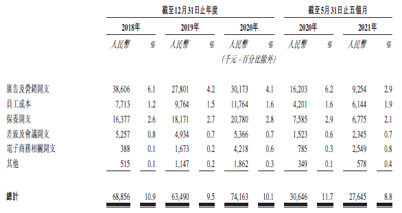 時代數據注意到,銷售及經銷費用也是讀書郎教育的重要成本支出。據招股書數據顯示,2018年至2020年以及2021年前5個月,公司的銷售及經銷開支分別為6885.6萬元、6349萬元、7416.3萬元和2764.5萬元,分別佔總營收比為10.9%、9.5%、10.1%和8.8%。
