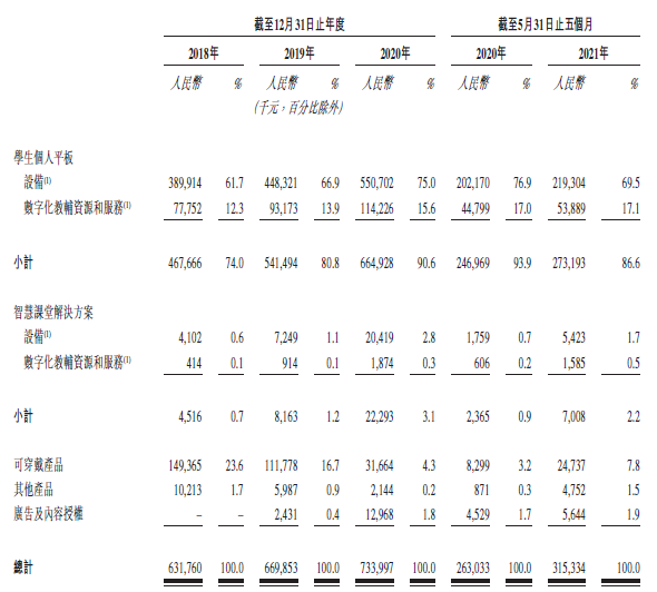 儘管智慧課堂解決方案業務得以保留,但智慧課堂解決方案業務的營收佔比一直處於較低水平。2018年至2020年以及2021年前5個月,智慧課堂解決方案業務的收入分別為451.6萬元、816.3萬元、2229.3萬元和700.8萬元,分別佔總營收比僅為0.7%、1.2%、3.1%和2.2%。