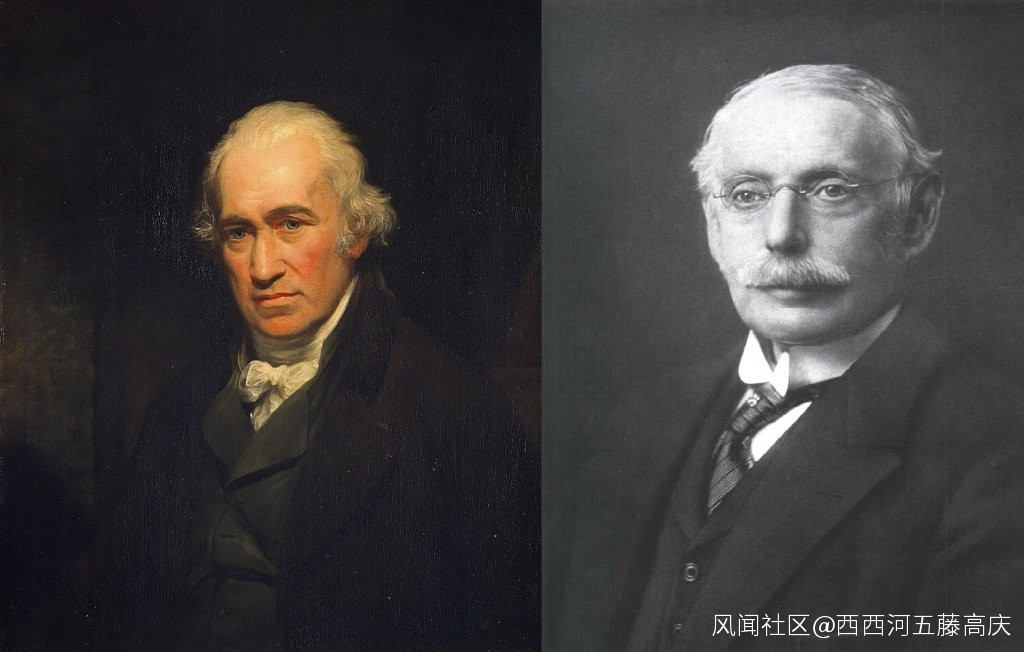 但其實這16艘戰列艦武裝大遊行時已經落後,1906年英國服役了劃時代的無畏艦(上圖),讓所有的前無畏艦都變成了廢物 -- 老大給暴發户上了一課,離美國變成新老大還遠着呢。無畏艦除了在火力和防護上面有革命性的進步,動力系統也改用了帕森斯(Parsons)蒸汽輪機直接驅動螺旋槳 -- 英國人帕森斯就是蒸汽輪機的發明者,下圖就是蒸汽動力的兩位祖師爺,左詹姆斯·瓦特右查爾斯·帕森斯,蒸汽動力雖然聽起來落後,即使在今天無論核電還是火電甚至燃氣輪機聯合循環都離不開蒸汽,只可惜在它的老家英國渣都不剩了,兩位老先生不知在九泉之下作何感想。。。