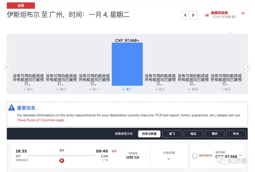 所謂的“臨近”其實時間也並不近。比如現在查詢土耳其航空的官網,近1個月的回國航班幾乎買不到,最早的官網可售航班是2022年1月4日,但經濟艙也顯示售罄,只有近10萬的商務艙。