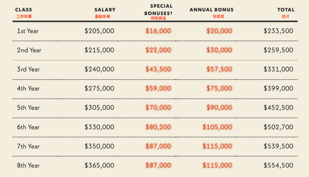 拿7年級的律師舉例,他們最高可以獲得11.5萬美元(73萬人民幣)的固有年終獎和20%特別獎金,大約在7萬美元(44萬人民幣)左右。
