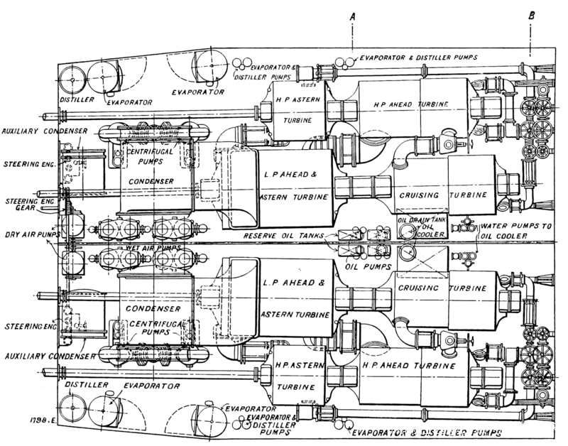 當時蒸汽輪機用在軍艦上有三大問題,一個是上面提到的需要同時優化高低速性能,這個問題的解決是靠加裝一個小型汽輪機專門跑低速,被稱為巡航汽輪機,增加了系統複雜度。下圖顯示的是當時四軸驅動的戰列艦典型動力配置,可以看出有多麼複雜:Turbine就是汽輪機,汽輪機分高低壓,H.P.是高壓L.P.是低壓,鍋爐來的高壓蒸汽首先進到高壓汽輪機做功,出來後變成低壓蒸汽,再進低壓汽輪機做功一次,Ahead和Astern分別指的是前進的(術語正車)和後退的(術語倒車,這個設備其實更常用來減速),Cruising就是巡航。圖上可見四類汽輪機各兩個,高壓正車、高壓倒車、低壓正/倒車、和巡航。八個汽輪機驅動四個傳動軸,另外圖上沒有任何變速設備,汽輪機經過傳動軸直接驅動螺旋槳。這還不算最複雜,為了進一步提高效率省燃料,後來有的戰艦上出現了中壓正車倒車汽輪機。