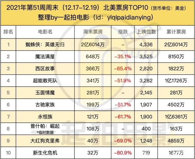 本週將進入非常重要聖誕檔期,但《蜘蛛俠:英雄無歸》的發揮卻受到很大影響:一方面防疫管控在不斷升級,因為奧密克戎毒株肆虐上週挪威、丹麥和愛爾蘭已經緊急關停電影院導致影片被迫撤檔,相關分析人士認為還會有更多歐洲國家進一步縮緊政策。另一方面數部重磅大片將入場分流觀眾,首批市場表現不佳的《黑客帝國》本週將會登陸包括美國在內的71個市場並同步流媒體,而《王牌特工:源起》、動畫片《歡樂好聲音2》也將會在北美及多個重要市場公映。