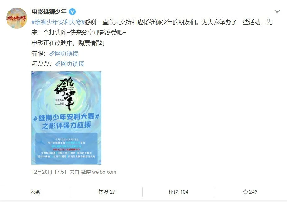 《雄獅少年》未必能成為“年度黑馬”,但是它在題材、製作、故事方面的探索,是中國動畫電影市場難得的創新。而它在宣發中遇到的種種問題,也給以後國產動畫電影項目敲了警鐘。電影微博直到12月20號才匆匆開啓#雄獅少年安利大賽#,試圖通過影迷的二創讓電影觸及更多的年輕觀眾,同日也邀請明星@吳京微博為電影宣傳,這些宣傳到底是為時已晚,又或能讓票房呈現出細水長流之勢,一切都只能交給時間了。