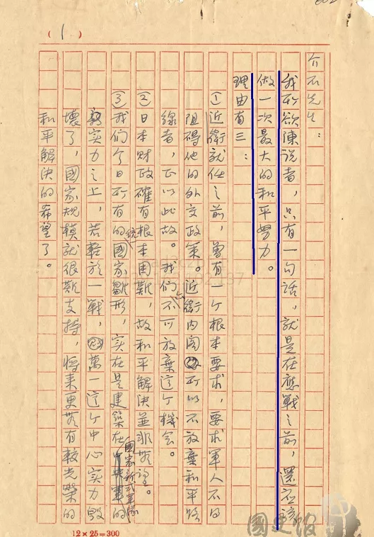 上圖是全面抗日戰爭爆發後,胡適給蔣介石的親筆信,藍框中部分,是胡適勸説蔣介石,放棄東三省,承認偽滿洲國,走所謂和平之路….