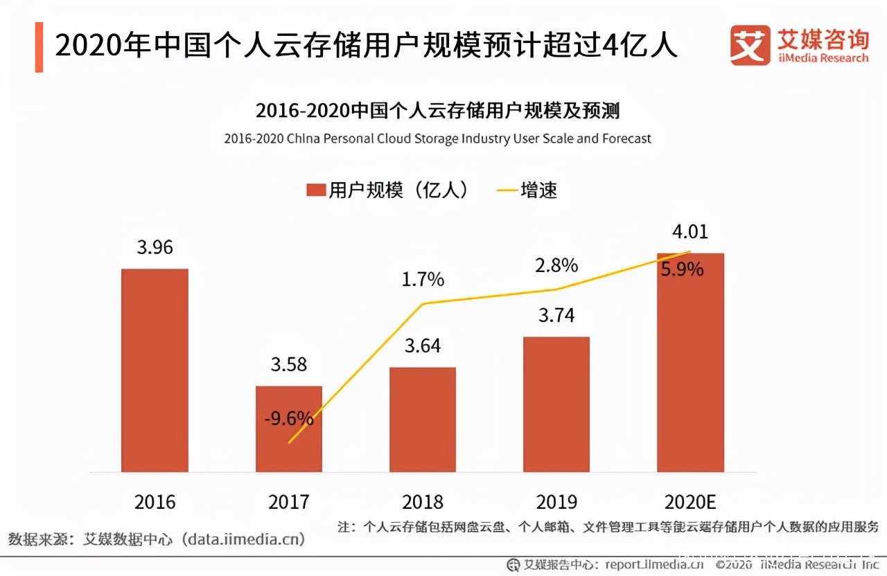 個人網盤市場風雲再起根據艾媒諮詢的數據顯示,在遭受2016年的整治打擊後,國內的個人網盤市場發展迴歸常態,並帶動雲存儲用户規模逐漸增長,預計到2020年達到4.01億人。2020年7月,國內雲盤存儲App月活躍用户分佈中,百度網盤的MAU達3983.2萬人。