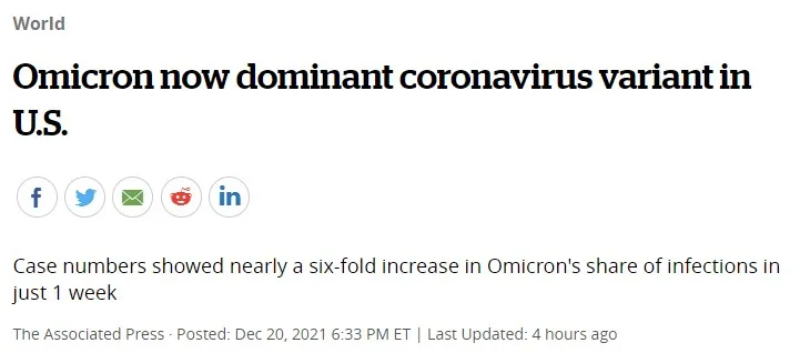 自今年6月底以來,Delta變種一直是美國的主導病毒,截至11月底,仍有超過99.5%的病毒是Delta。可就在最近一個月的時間,Omicron就迅速成為主導,且導致全國每日新增病例數連翻3倍,非常令人擔憂。
