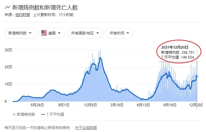 美國最近迎來了嚴重的疫情反撲。從11月以來的最近一個月,每日新增確診病例一直呈現上升趨勢。並且於昨日(12月20日),新增病例數更是飆升至298,761例,直逼30萬!