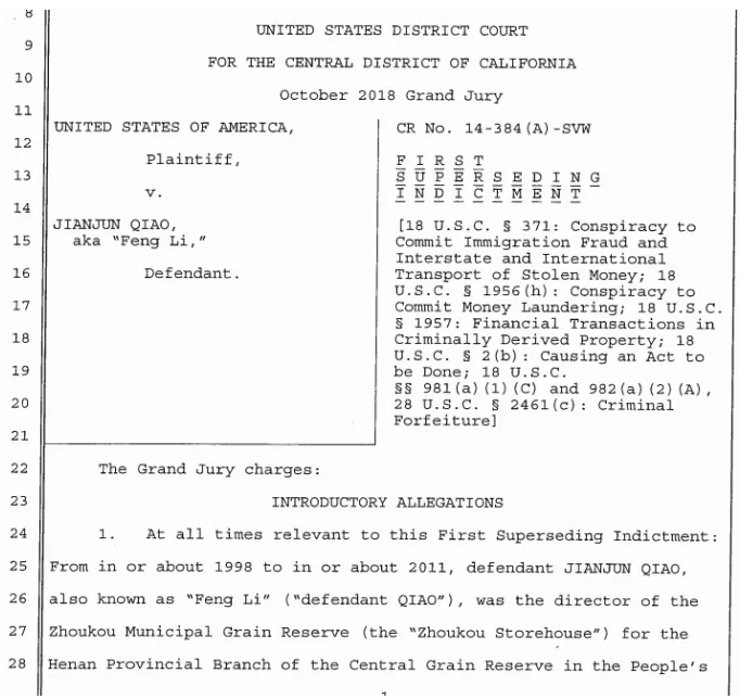 昨天(12月20日,週一)上午11點,前中國三號紅通人物喬建軍(Jianjun Qiao,音譯)在洛杉磯聯邦法院出庭受審,並對聯邦數項犯罪指控部分認罪。