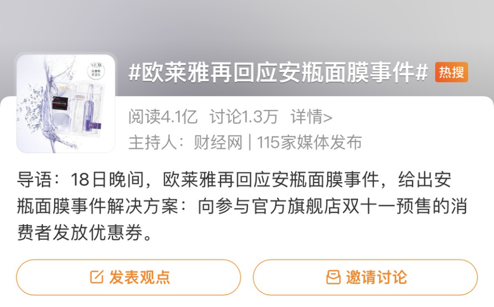 雙十一結束後,消費者在黑貓投訴平台發起集體投訴,稱其10月20日在李佳琦直播間搶購的歐萊雅安瓶面膜,預售價為429元;而11月11日當天在歐萊雅自己的直播間購買現貨只需257元。這與直播間的宣傳不同,隨即,“歐萊雅安瓶面膜退差價”的話題持續衝上熱搜。