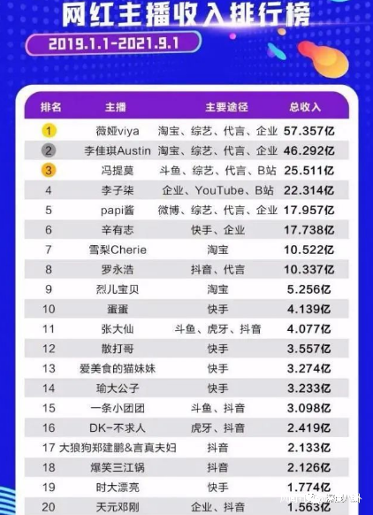 真實情況要兼聽則明,就像網絡上前段時間就流傳着薇婭和李佳琦都被查了,他們雙雙否認,可真實情況是税務問題查了好幾個月了,有沒有被查,他們早就清楚明白。還有一份被否認了的收入排行榜。