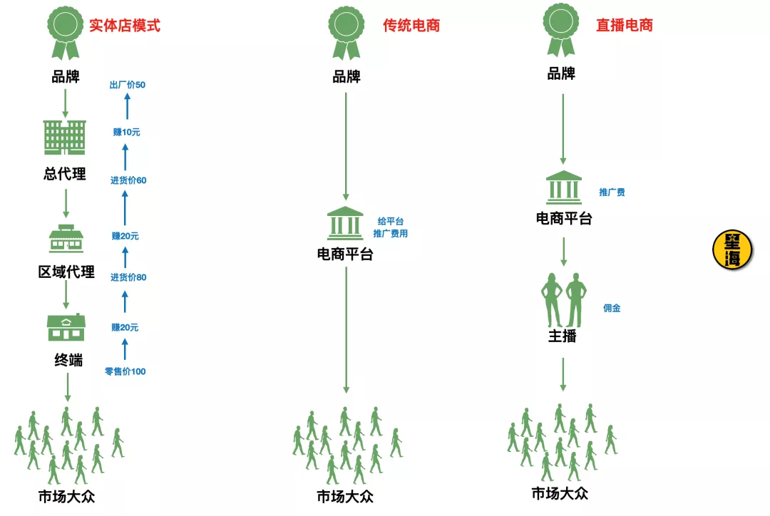 以前我們説,電商能夠比線下便宜的本質,除了租金、水電這類開店成本,最重要的是減少了中間環節。少一級經銷商,就多一份利潤空間,也就多一份降價空間。如果按照這個邏輯,重新來看線下實體店、傳統電商、直播電商的供應環節: