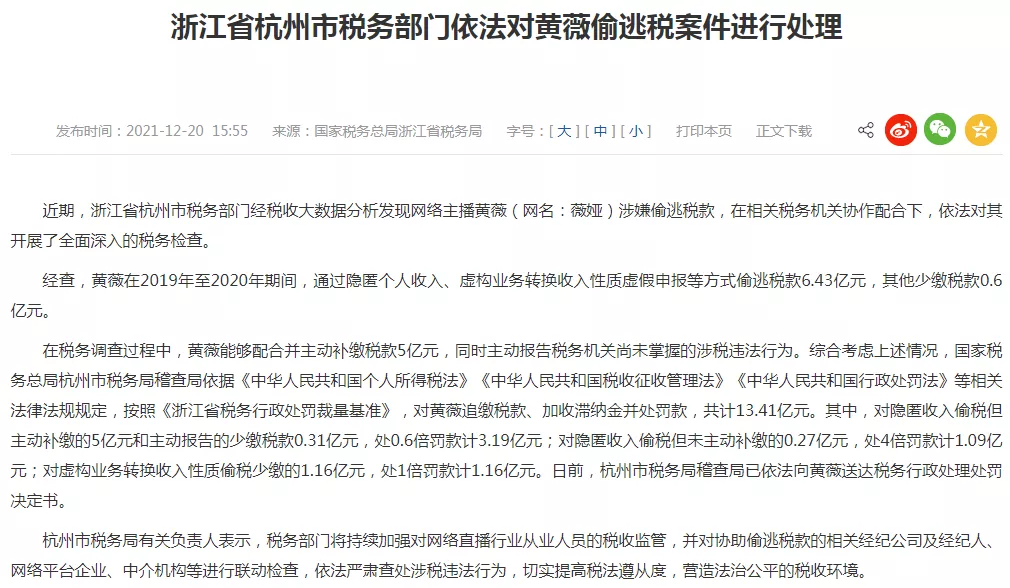 昨天的大新聞,想必大家是都看到了。薇婭偷逃税追繳並處罰款13.41億元,現在各大平台號也被封了,她不是第一個,當然也不是最後一個。税務部門明確表示,除薇婭外,仍有部分頭部主播偷逃税未被披露,各方正商討公佈的恰當時機。