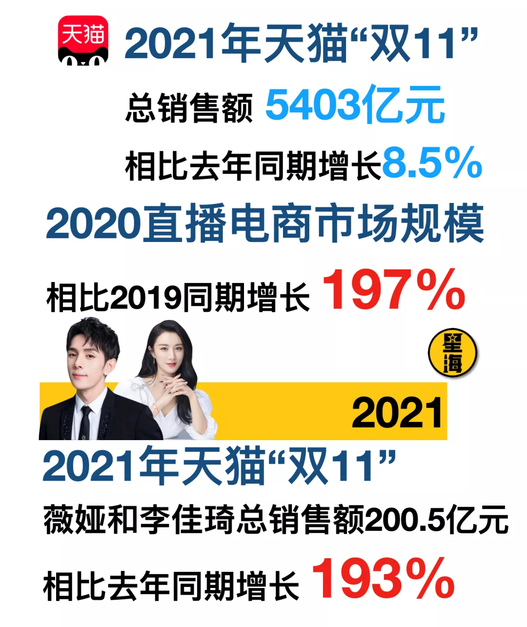 和這個數據基本持平的,是2020年中國直播電商市場規模的年增長率197%。再往前推一年,這個數據是245.9%。所以不是薇婭李佳琦帶飛了直播電商,而是直播電商要崛起,沒有薇婭李佳琦,也會有李婭薇佳琦,不愁沒人一天銷售200億。