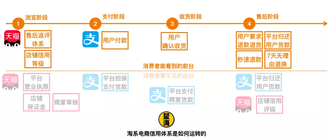 京東是做自營電商,自建供應鏈的,所以這方面有天然的優勢。在洪荒初開年代,人們對整個網絡都還好無信任感的年代,淘系花費了巨大的努力建設自己這套信用體系,甚至就是為此才催生了支付寶: