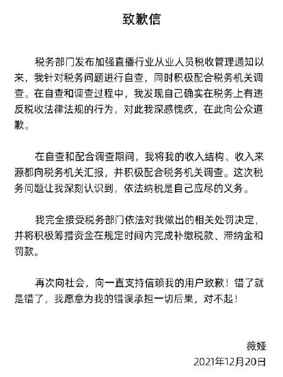 從上個月雪梨被罰的時候,她的聲明就説自己此前不懂這個,就是交給專業的一些做“税務規劃”的團隊去幫你做。到了薇婭,她的聲明中也説配合調查的過程中,才深入認識到自己的錯誤……
