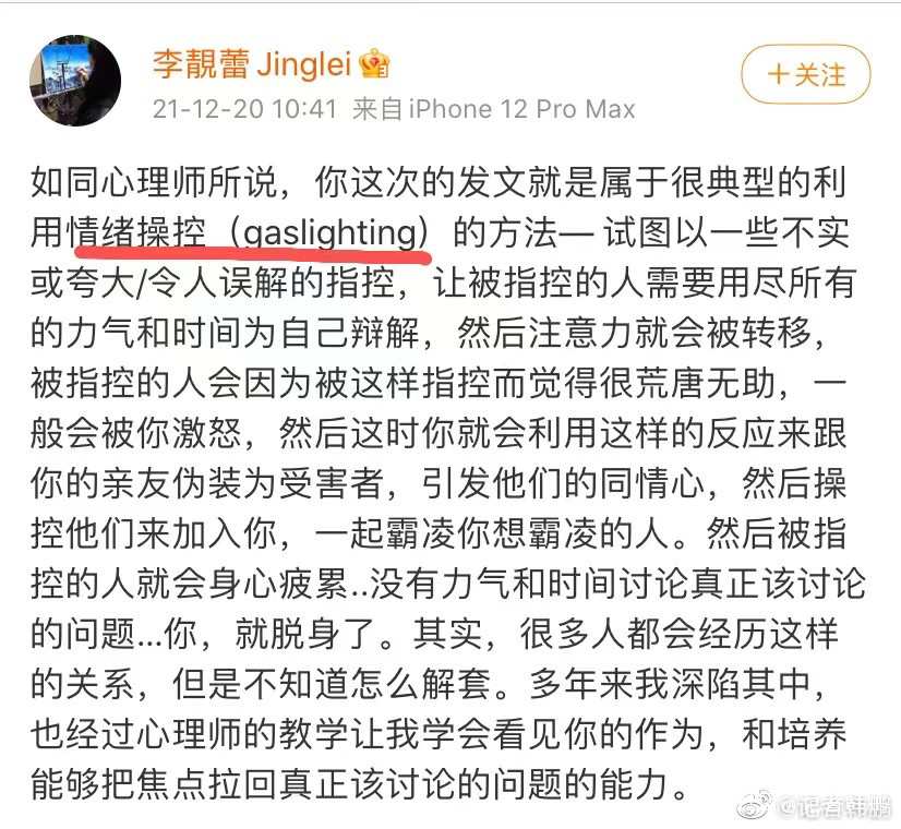 李靚蕾説王力宏經常對她搞“Gaslighting(煤氣燈)”情緒操控,美國政客也一樣,就是想對西藏搞“煤氣燈”操作。