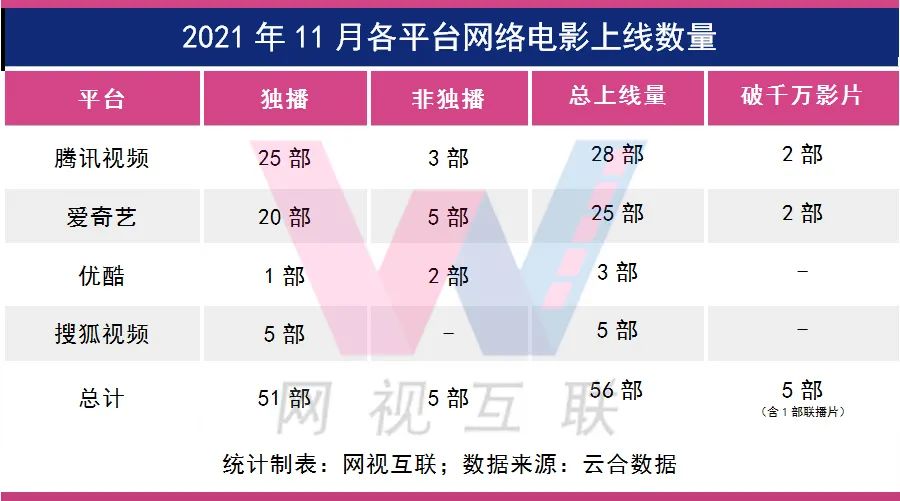 在11月份上線的56部網絡電影中,有51部獨播影片,5部非獨播影片。