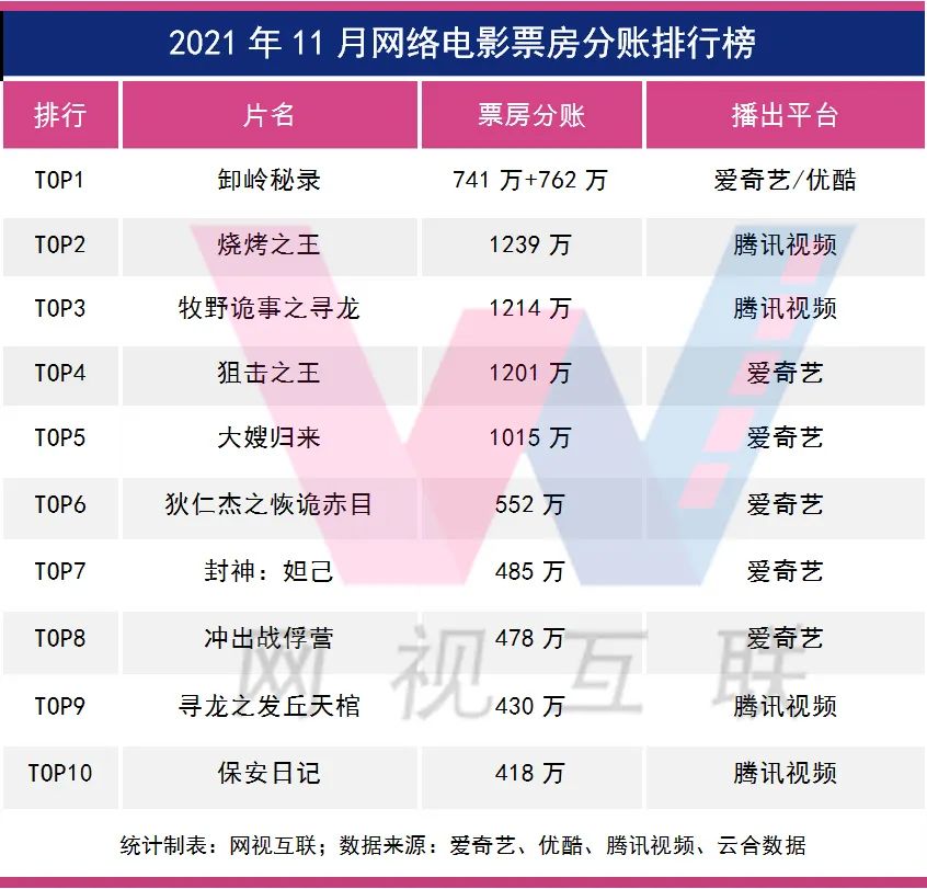 在11月份上線56部影片中,有5部票房破千萬,其中4部為獨播片,騰訊視頻和愛奇藝各2部,1部為聯播片,為愛奇藝和優酷聯播的《卸嶺秘錄》。