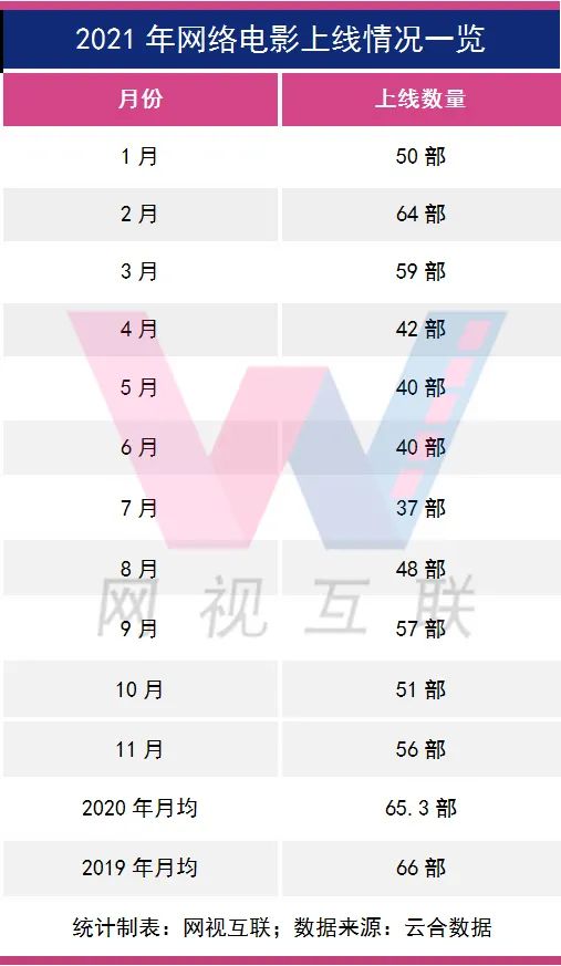 據云合數據提供給網視互聯的數據顯示,2021年11月份全網上線網絡電影共56部。就數量而言,雖然遠遠低於過去兩年的月平均上線數量,但放在2021年已屬正常偏上水平。
