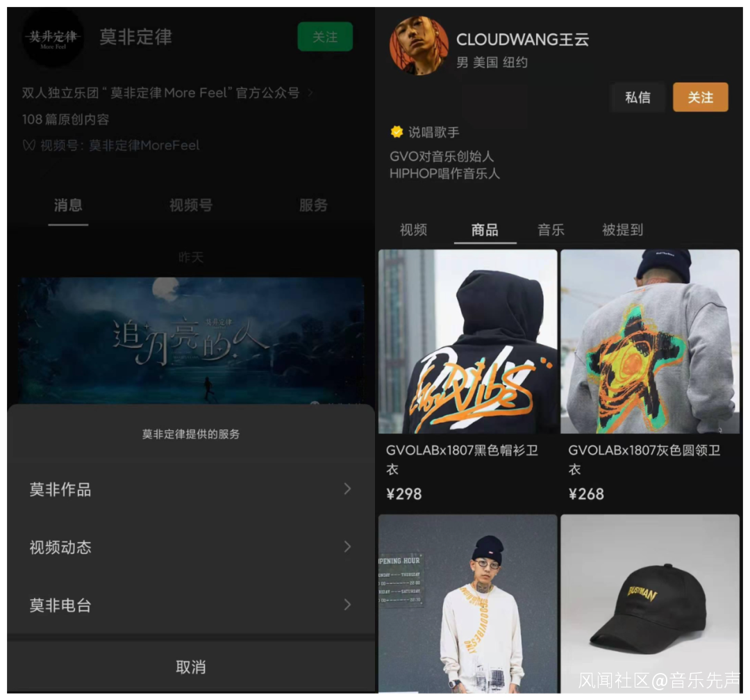 與抖快基於用户個人偏好的推薦機制不同,微信視頻號主要採用協同過濾模型進行內容推薦,即認為用户微信好友喜歡的內容,用户大概率也會喜歡。在這種“同好”推薦的形式中,音樂內容在社羣中產生裂變,使得音樂人的“冷啓動”更為簡單。此外,視頻號還允許音樂人在主頁添加公眾號、小程序等鏈接,建立並將觀眾引流至自己的內容圈和變現渠道,建立起具有較高粘度的粉絲社羣。