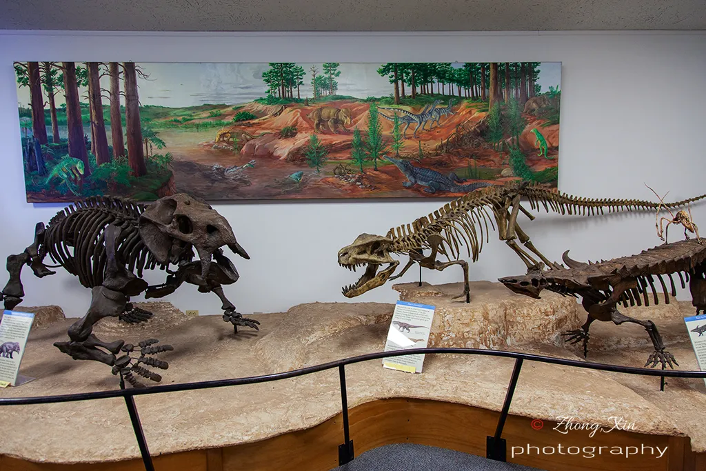 左一就是扁肯氏獸 Placerias hesternus。硅化森林國家公園遊客中心的小型博物館Rainbow Museum裏,陳列了很多硅化森林同地層的動物化石;圖中這3種看上去像恐龍,其實都不是,它們比多數恐龍要早得多。扁肯氏獸屬於獸孔目,和哺乳動物關係更近;中間的是主龍類-偽鱷類下的掠食者後鱷龍 Postosuchus kirkpatricki,最右則是植食性的鏈鱷 Desmatosuchus | 鍾蜀黍