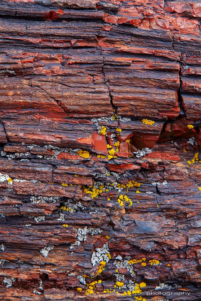 這些硅化木上常覆蓋着明黃色的地衣,這些地衣會分泌一些有機酸如草酸,可以更強烈地侵蝕岩石——這片森林最後的遺蹟也將無法逃脱風化作用,成為土壤,最終迴歸於地球的物質循環之中 | 鍾蜀黍