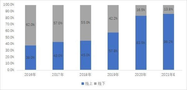 便攜儲能產品作為消費電子類產品,目前幾乎所有的便攜式儲能品牌企業均採用線上、線下相結合的模式實現全球化銷售,其中線上銷售是其最主要的銷售渠道。2016-2018年,線上銷售佔比不到50%,2020 年“新冠”疫情暴發以來,全球線上消費習慣加速養成,消費習慣的日益普及將有助於便攜儲能行業的全球化發展。2021年,全球便攜式儲能的線上銷售比例已超過80%。