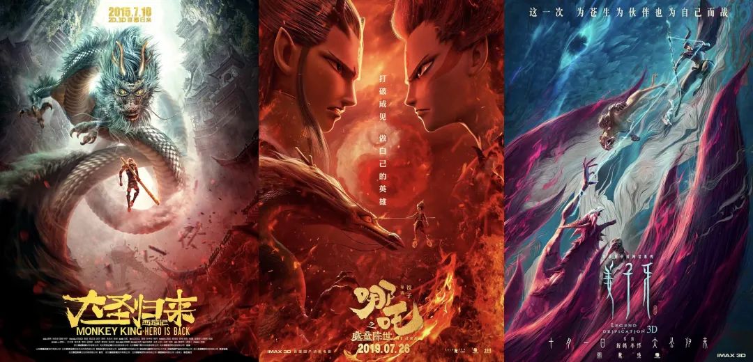 神話題材影片一定程度上存在創作定式,即依託公眾熟知的英雄角色,對其原有的成長曆程與矛盾衝突進行二次加工的創新表達,神話題材的廣泛IP認知基礎可以迅速讓影片觸達廣大受眾羣體,助力影片後續口碑發酵與票房突破,這也是過往幾年裏國產動畫方式的常見操作方式。