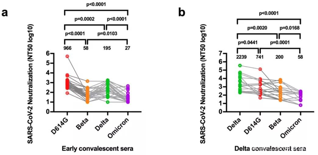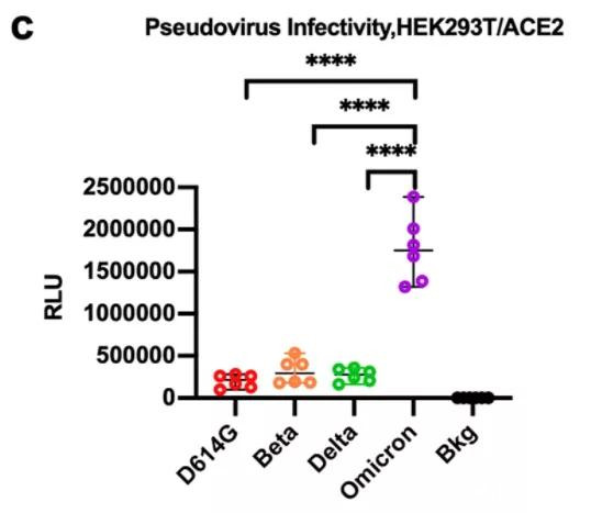 實驗顯示,早期毒株感染者和Delta感染者的恢復期血清對Omicron的中和抗體滴度分別下降了36倍和39倍,顯著低於其他株感染的中和抗體滴度。該結果表明,早期毒株感染者的恢復期血清對假型Omicron病毒的中和能力非常低,也就是説奧密克戎對病毒感染或疫苗接種建立的現有保護存在明顯免疫逃逸現象。