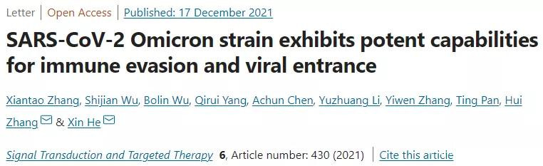 [4] Zhang, X., Wu, S., Wu, B. et al. SARS-CoV-2 Omicron strain exhibits potent capabilities for immune evasion and viral entrance. Sig Transduct Target Ther 6, 430 (2021). https://doi.org/10.1038/s41392-021-00852-5