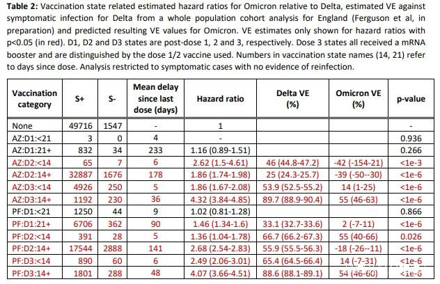 數據顯示,在之前感染過早期新冠病毒的情況下,奧密克戎變異株的再感染風險是德爾塔的5.41倍(95%CI: 4.87-6.00)。而從疫苗保護的角度來看,完全接種2針牛津疫苗和輝瑞疫苗的2周後,感染奧密克戎毒株的風險分別是感染德爾塔的1.86倍(95%CI: 1.67-2.08)和2.68倍(95%CI: 2.54-2.83)。