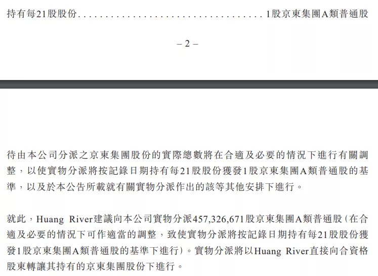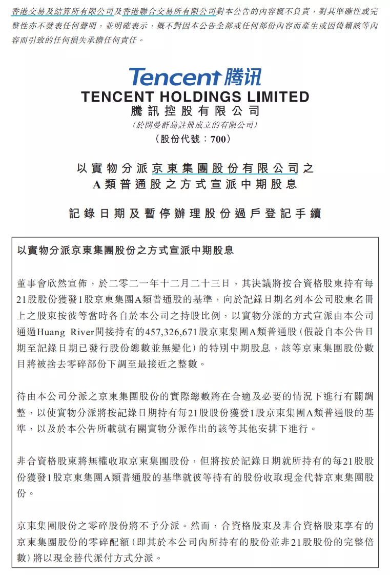 其中,根據公告,按合資格股東持有每21股騰訊控股股份獲發1股京東集團A類普通股的基準,以實物分派的方式派發由騰訊控股通過Huang River間接持有的45732.6671萬股京東集團A類普通股的特別中期股息。