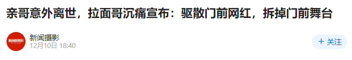 “我再也不相信網絡,不希望主播再從我家門口搞直播。”年末,在親大哥跑運輸時意外離世後,拉麪哥懇求門前的網紅離開,還給他平靜的生活,“你們想想我現在的心情行嗎,你們能同情我嗎,我希望你們走吧。”
