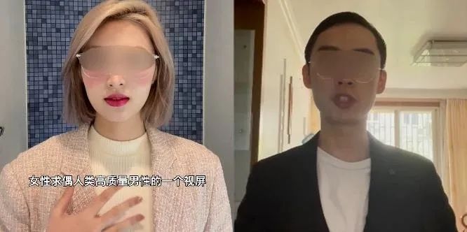 在一則“人類高質量男性求偶人類高質量女性”的視頻中,徐勤根身着西裝,化着詭異的妝容,自稱“人類高質量男性,是國內少數高淨值的男性之一”。