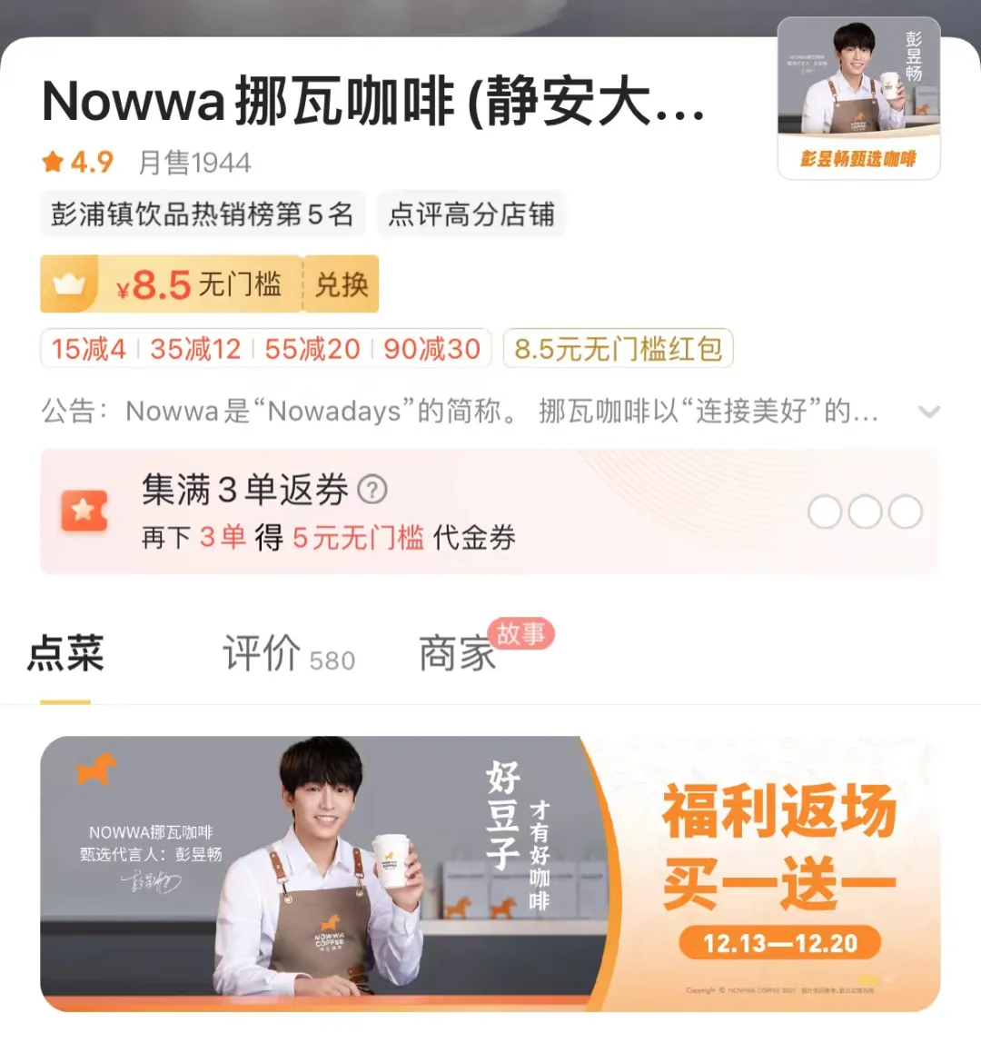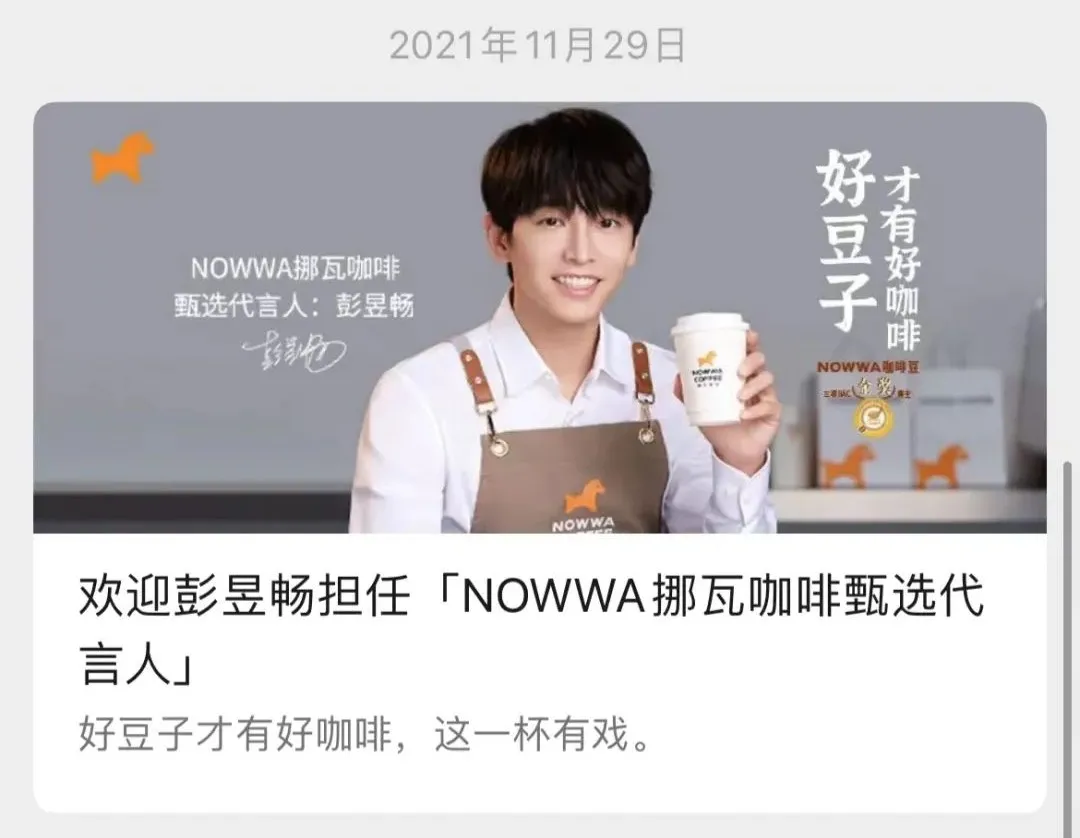 11月29日,挪瓦咖啡在官方公眾號中公佈,已成功簽約藝人彭昱暢作為其“甄選代言人”。當天,挪瓦咖啡微信小程序同步上線“全渠道全門店限時兩週買一送一”、限時贈送彭昱暢周邊產品等活動。