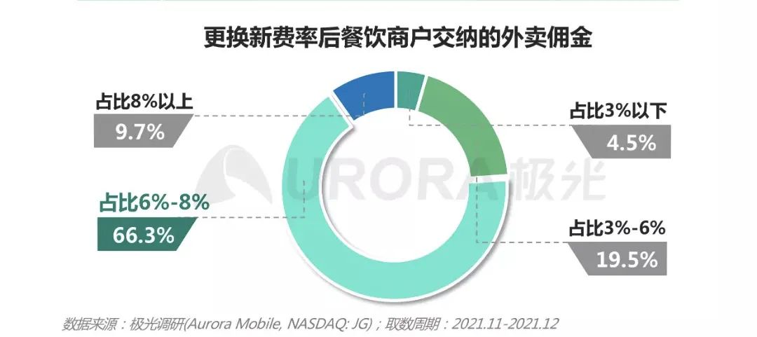 但商家擔心的還是佣金問題,佣金如果過高,開拓外賣業務費力不討好,好在費率透明化改革,緩和了商家和平台的衝突。根據《2021餐飲外賣商户研究報告》顯示,平台實行費率改革後,在已更換新費率的餐飲外賣商户中,90.3%的商户表示向平台交納的佣金低於8%,其中66.3%的商户佣金交納比例在6%-8%區間中。