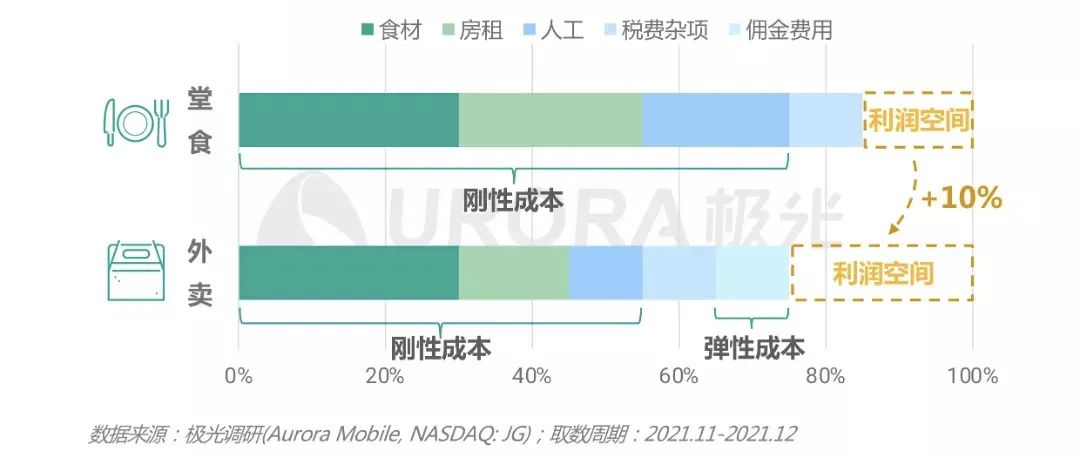 這也是國內餐飲開始重視對外賣業務投入的原因,相比較堂食的成本結構,外賣業務的成本更靈活一些。從報告的圖中可看,外賣的剛性成本如房租和人力支出等可得到壓縮,而多出的包裝材料、外賣佣金(技術服務費)這兩項彈性支出,都只有在發生交易時產生。因此,外賣整體的利潤空間相較於堂食能夠獲得10%左右的提升。