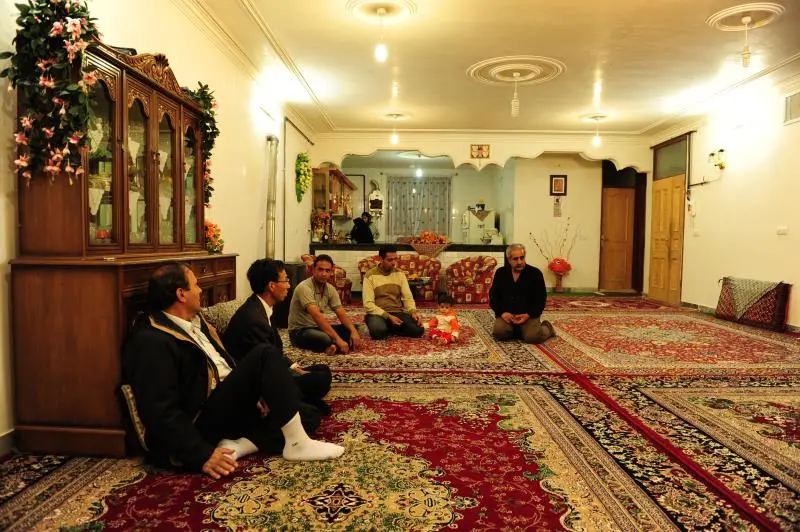 開車跟隨他來到一條燈光昏暗的小衚衕,我們走進他家。不出所料,他家就是一個典型的伊朗普通百姓家的樣子。客廳很大,一個立櫃,兩對沙發,一個茶几,沒有椅子,客廳顯得空蕩蕩的。傳統的伊朗人家就是沒有椅子也沒有沙發的,他家有沙發已經不十分傳統了。像所有普通伊朗人家一樣,他家的機織化纖地毯一直鋪到牆邊。普通人家或者説傳統人家的地毯更主要的是功能性的,主客都坐在地毯上,地毯上散落着幾個靠墊,你可以立起靠墊倚牆而坐。而西化的人家裏,地毯只是裝飾品,不會鋪滿地板。