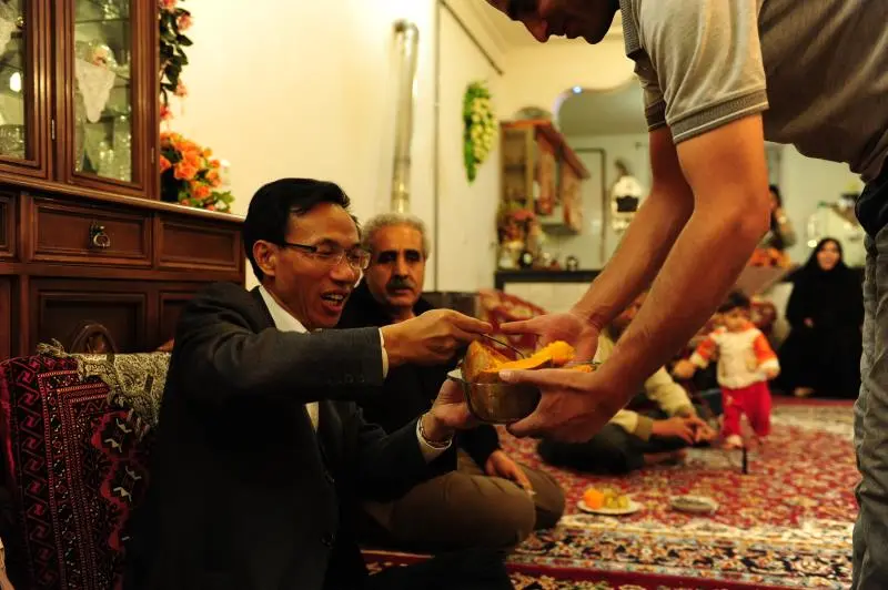 2011年12月21日,冬至,我們正在外出差,途中遇到了前不着村後不着店的情況,隨即趕往相距最近的一個安靜的小城市布魯傑爾。晚上7點到達,入住一個四星級酒店,吃完飯、看完新聞後離就寢時間尚早,我們就到酒店大堂詢問服務生他們的冬至夜怎麼過,酒店有沒有冬至夜的節目。他們説酒店沒有,這種節日大家都是在自己家裏過,他們10點下班,然後就回家過節。其中一個年紀較長、名叫托拉比的電工熱情地説:“歡迎你們到我家去過節。”能有這麼好的機會了解伊朗民風和文化當然很好,我們也知道伊朗人一向熱情真誠,可我們作為陌生人又是外國人,大晚上10點以後造訪人家還是第一次,我們不由得問他:“真的歡迎嗎?”托拉比回答:“當然真的歡迎。”