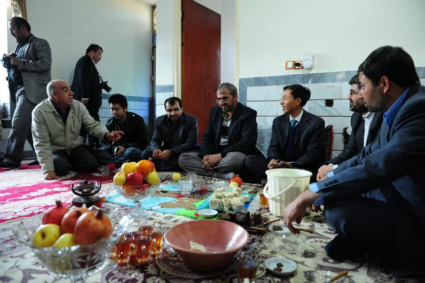 在2013年1月的一次出差途中,我們碰到了比古時給朝覲的客人留宿更讓人感動的事情。伊方陪同官員告訴我們,我們路上經過的一個地點附近,有一個村的村長邀請我們去做客。這本來是件很好的事情,可惜我們確有實際困難,先生抱歉地回答,因為我們的行程安排很緊,確實沒有時間去拜訪,並允下次再來的時候一定去拜訪。但那位村長執意讓我們在大路上一點不繞路不耽誤行程的情況下,在經過他們那裏時僅僅停一下車,表示希望見中國大使一面,以代表鄉親們表達對中國的友好之情。