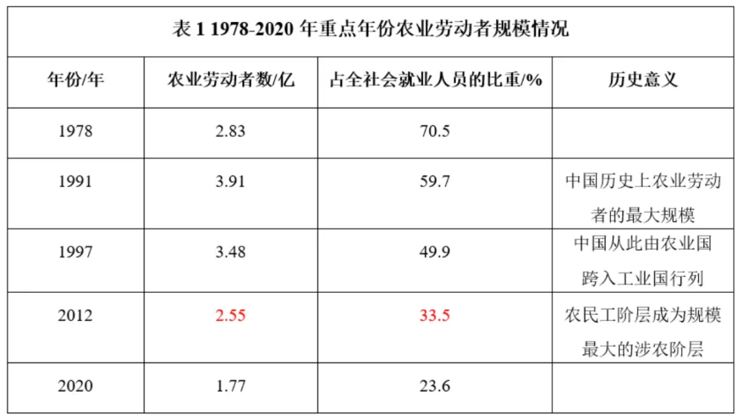 2012年,農民工規模首次超過農業勞動者規模,意味着中國人口規模最大的涉農階層由農業勞動者階層讓位於農民工階層。 2020年,農業勞動者人數減少至1.77億人,其在三個產業就業人員中的比重也下降到了23.6%。考慮到中國農民兼業經營現象比較突出,實際從事農業勞動的人員按當量計算實際規模可能更小一些。**但是,與西方主要發達國家農業勞動者在三個產業就業人員中的比重普遍低於10%的水平相比,中國的農業勞動力仍然處於富餘狀態,**提高農業生產效率和減少農業勞動者人數的空間仍然是很大的。